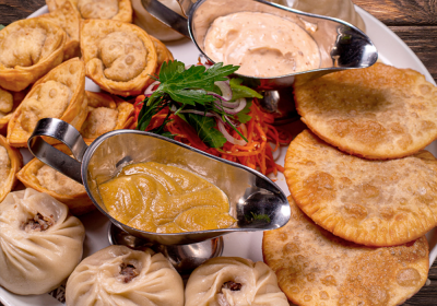 3 буузы, 3 буузы с бараниной, 3 хушуура, жареные пельмени